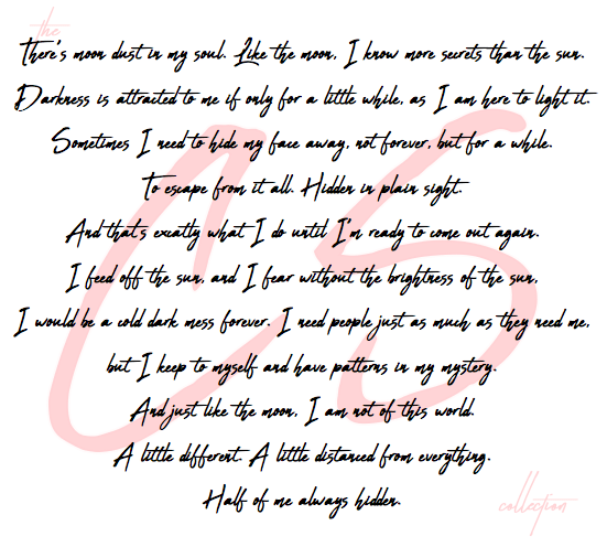 Poetry moon dust soul March 10, 2018by theCScollection Share Click to share on X (Opens in new window) X Click to share on Facebook (Opens in new window) Facebook Click to email a link to a friend (Opens in new window) Email Click to share on Pinterest (Opens in new window) Pinterest Like Loading... Related